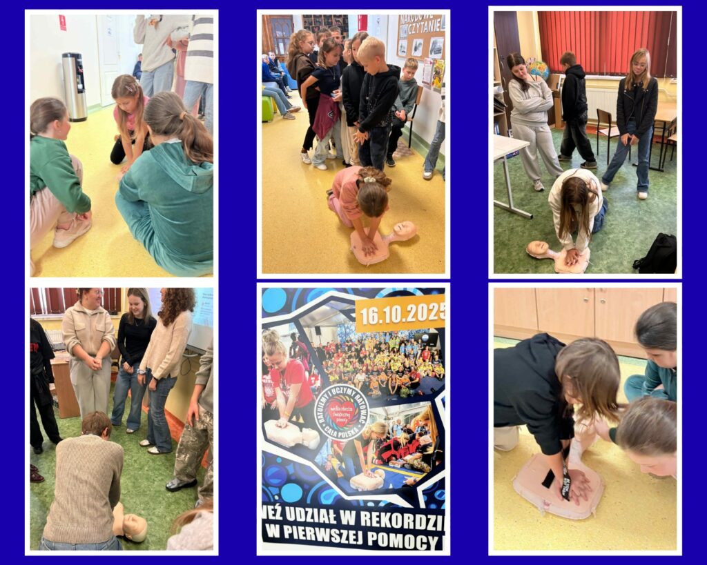 16 października 2025 r. nasza szkoła wzięła udział w ogólnopolskiej akcji „Ratujemy i uczymy ratować”. Podczas wydarzenia uczniowie uczyli się zasad udzielania pierwszej pomocy i wspólnie bili rekord w liczbie osób jednocześnie wykonujących resuscytację krążeniowo-oddechową.